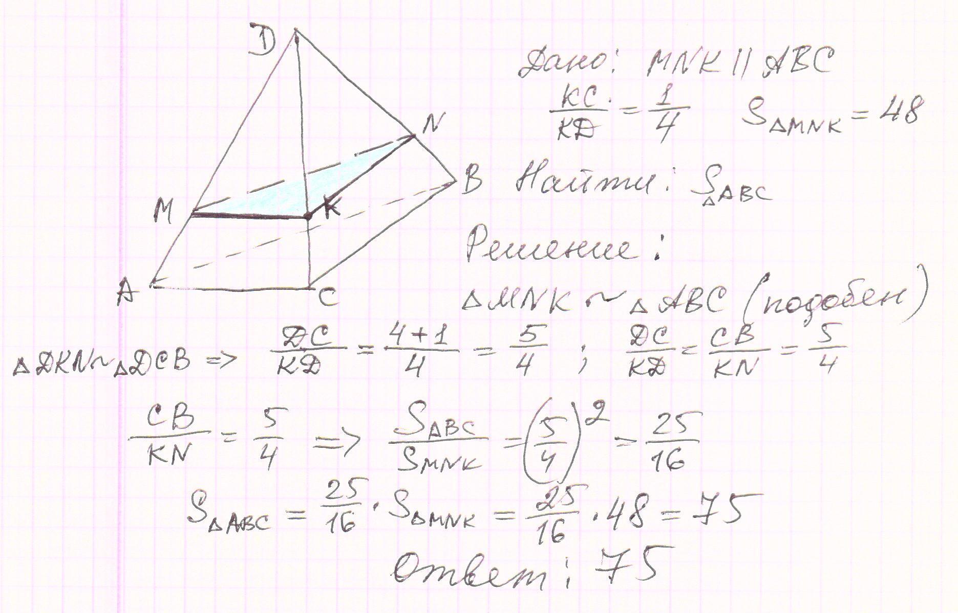 Через точку К на ребре CD тетраэдра DABC проведено сечение параллельно грани ABC. Площадь сечения равна 48, CK:KD=1:4. Найдите площадь грани abc