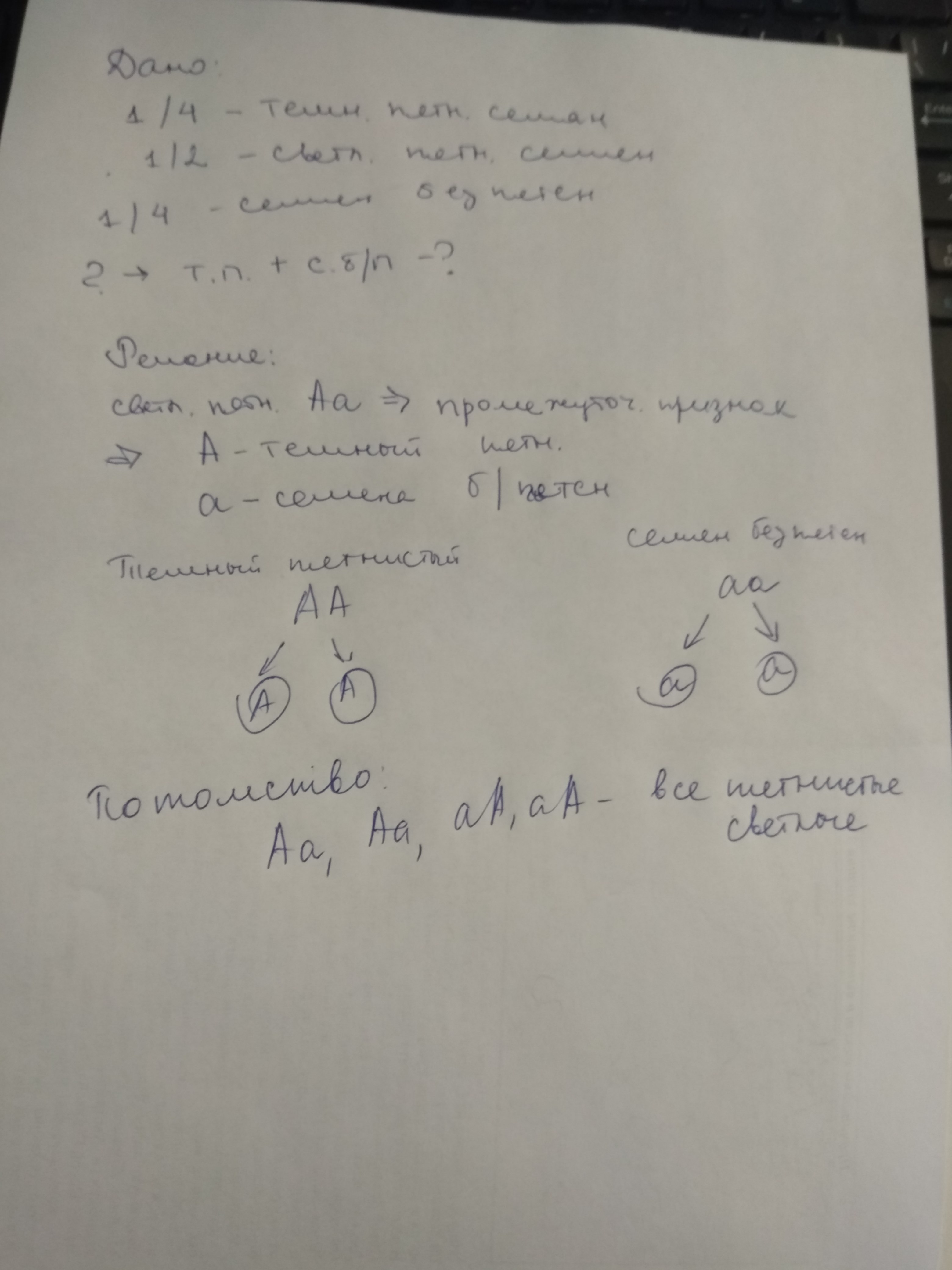 У одного японского сорта бобов при самоопылении растения, выращенного из светлого пятнистого семени, получено: 1/4 – темных пятнистых семян, 1/2 – светлых пятнистых и 1/4 – семян без пятен. Какое потомство получится от скрещивания растения с темными пятнистыми семенами с растением, имеющим семена без пятен?