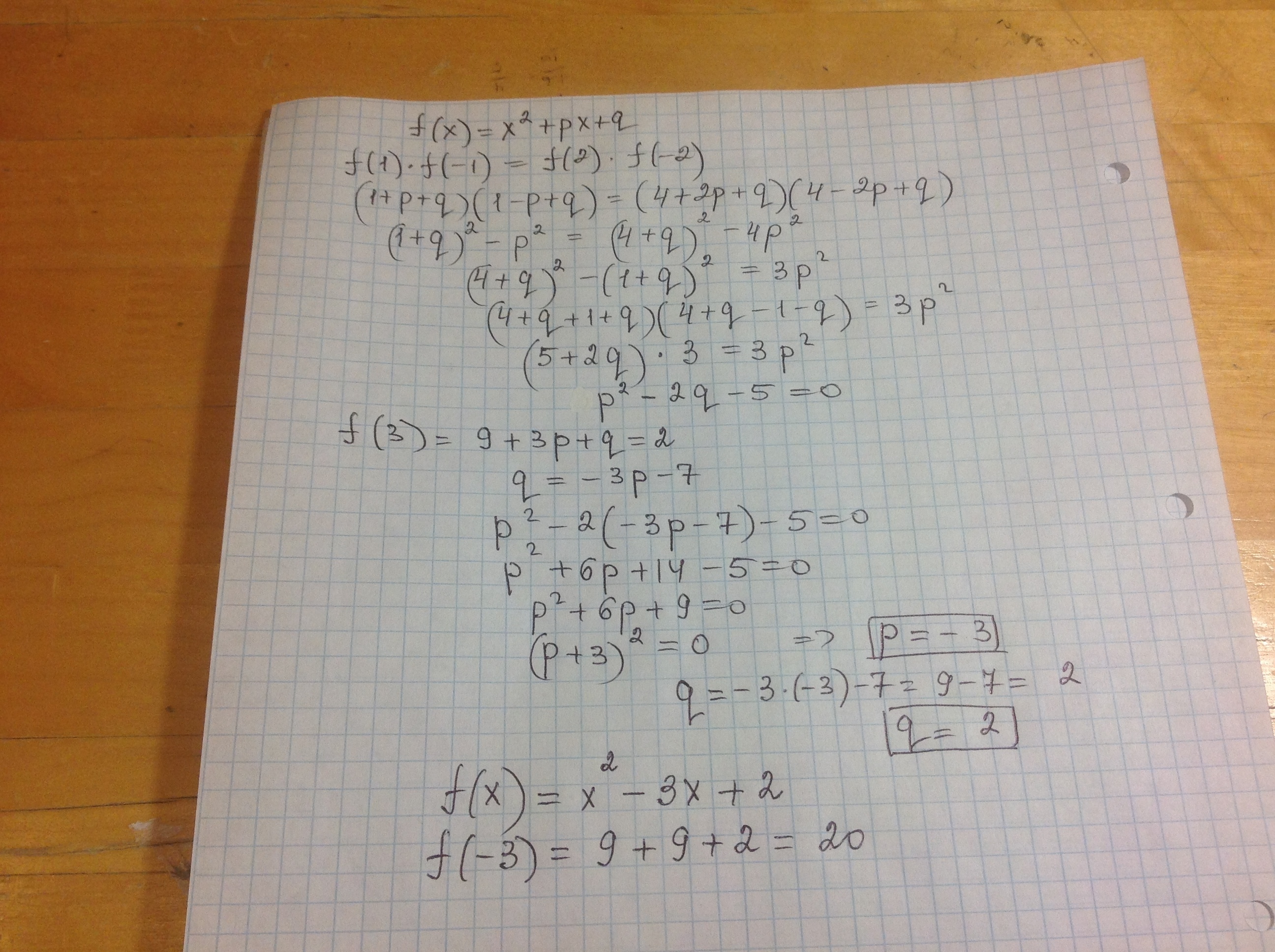 Про приведенный квадратный трехчлен f(x) =x²+px+q известно, что f(1)f(-1)=f(2)f(-2), а f(3)=2. Найдите f(-3).