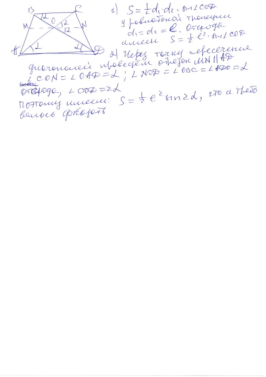Можно использовать и более простое решение - заменить равнобокую трапецию равновеликим прямоугольником с диагональю l и углом α, а площадь будет равна двум площадям треугольников с гипотенузой l: