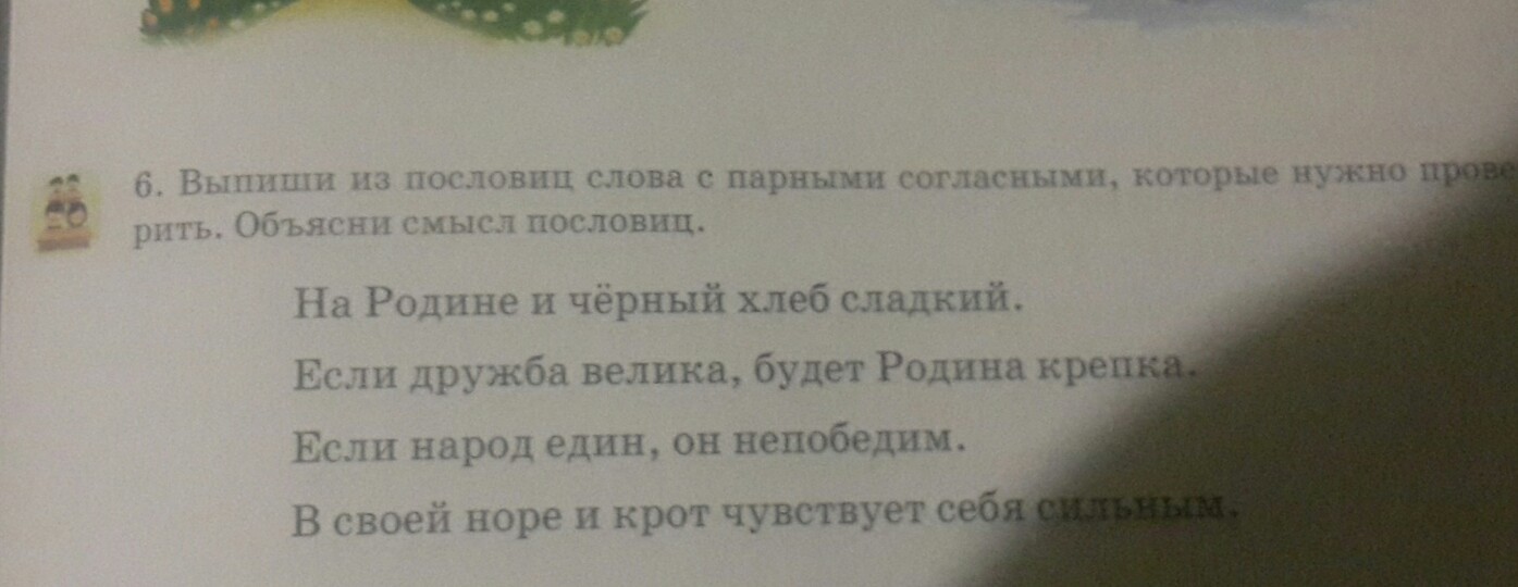 Сладкий- сладок, крепка-крепок, крот-кроты. На Родине и чёрный хлеб сладкий- на своей Родине всегда хорошо.Если дружба велика, будет Родина крепка- если народы не будут ссорится, то Родина будет стоять всегда. Если народ един, он непобедим-если люди будут все вместе держаться, то их не победить.В своей норе и крот чувствует себя сильным-если ты в своём доме, то ты чувствуешь себя хорошо.