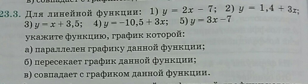1.а)у=8+2х б) у=3х+2 в)у=2х-7 2.а)у=3х-3,2 б)у=2,3+4х в)у=1,4+3х 3.а)у=х+4 б)у=4-х в)у=х+3,5 4.а)у=3х+2 б)у=5х-3 в)у=-10,5+3х 5.а)у=4+3х б)у=2х-1 в)у=3х - 7