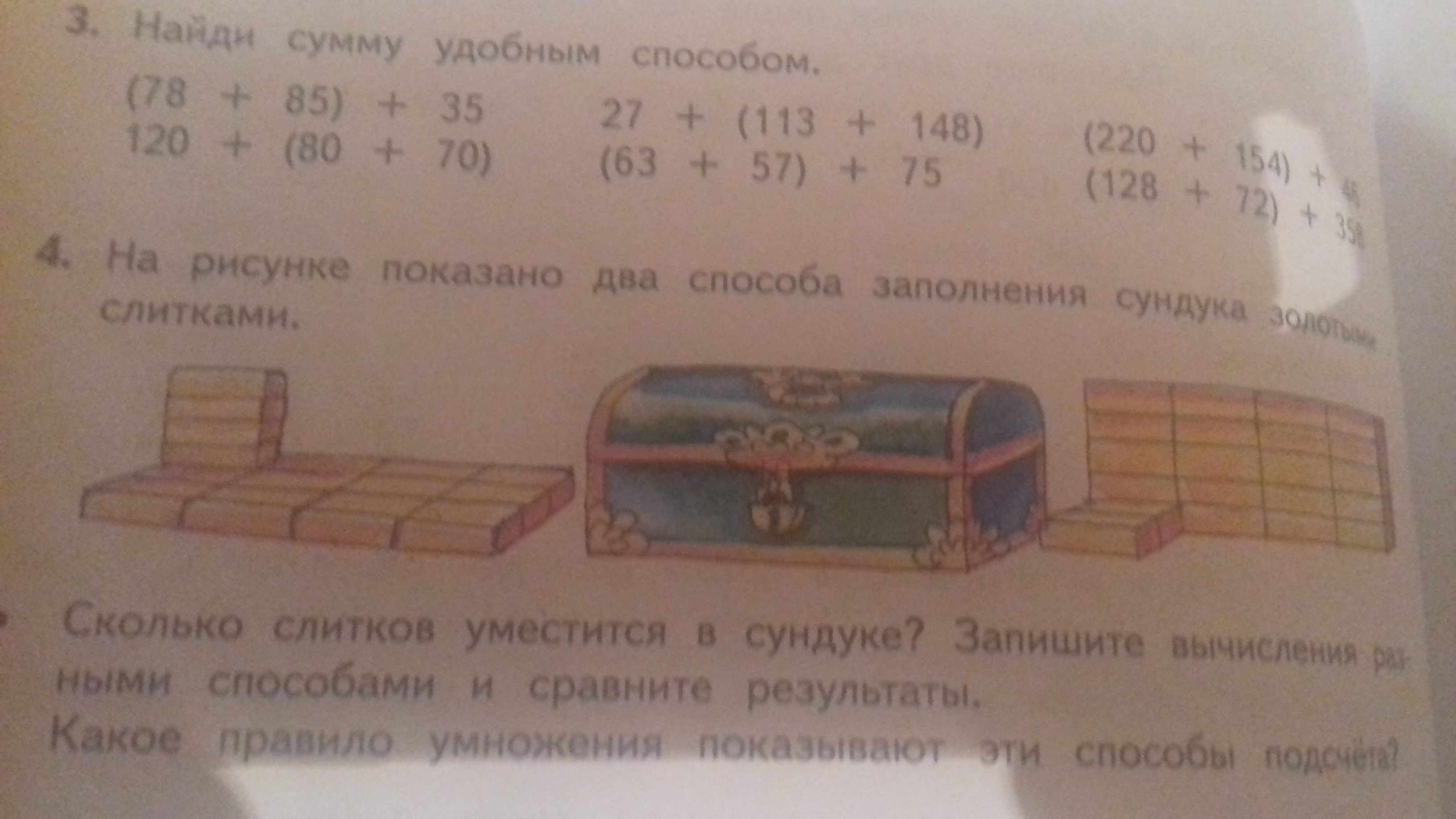 На рисунке показано два способа заполнения сундука золотыми слитками.Сколько слитков уместится в сундуке? Запишите вычисления разными способами и сравните результаты. Какой правило умножения показывают эти способы подсчёта?