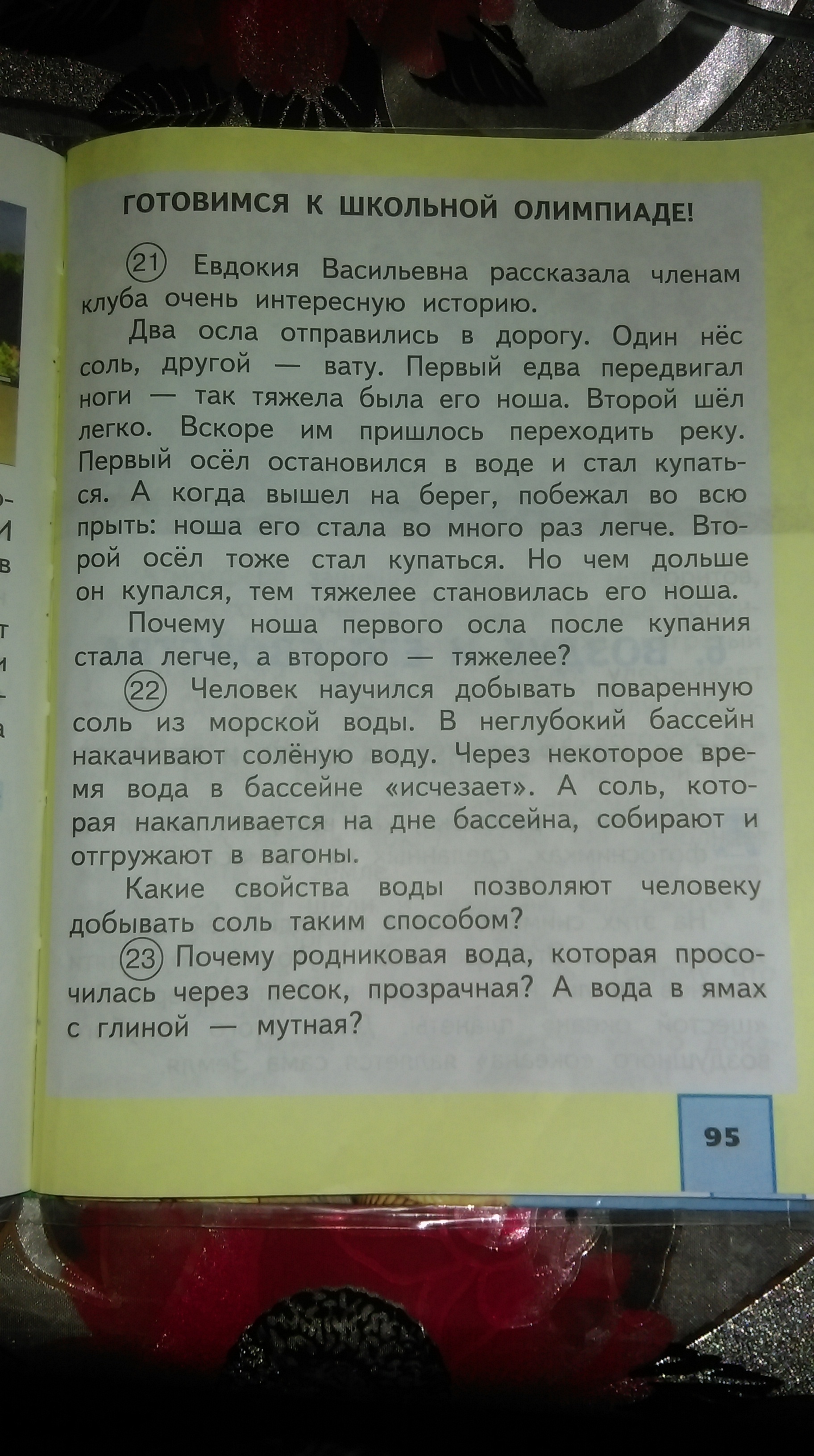 21 Вся соль первого растворилась и остались только мешки, а вата второго впитала всю воду и поэтому стала тяжелее.