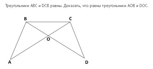 угол BAO=углу CDO т.к треугольники ABC и DCB равны , следовательно и соответственные элементы равны.