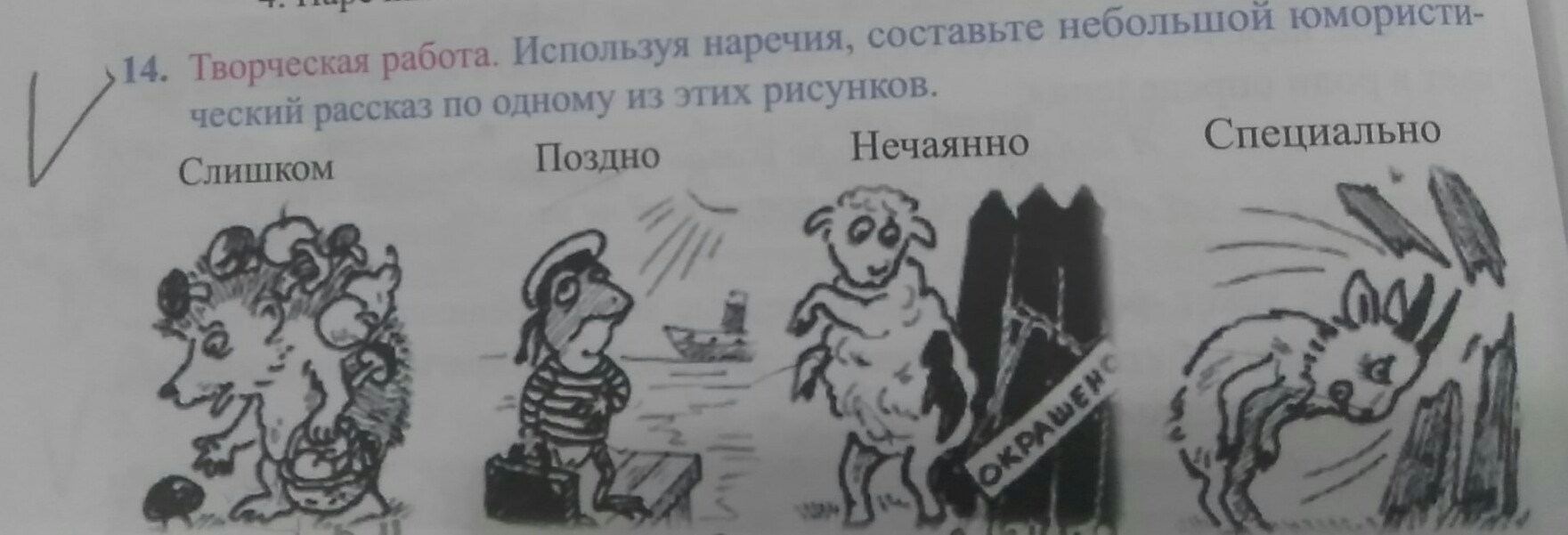 Шёл барашка по дороге искал свежей трави, штоб покушать, шёл-шёл и устал, а тут встетился забор с тенёчком а ищё с травой свёжей барашка дажу не заметил таблички "ОКРАШЕНО" и уселся под забор, покушал и заметил как покрасился подумал: "От прекрасной трави." И пошёл дальше.