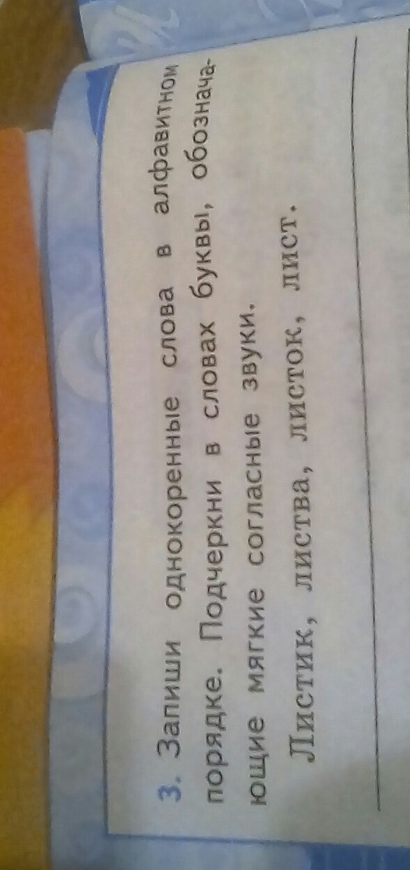 Лист (подчеркнуть букву Л), листва (подчеркнуть Л), листик (подчеркнуть буквы Л, Т), листок (подчеркнуть Л)