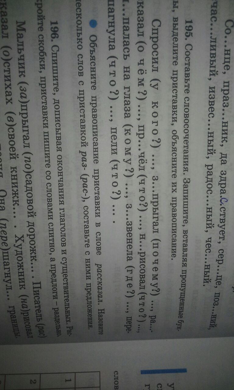 Спросил у друга, запрыгал от счастья, рассказал о победе, прочел книгу, нарисовал картину, попалась на глаза учителя, зазвенела в школе, перешагнула яму, пели инструменты. Рассказал - приставка рас, пишется с потому что буква после приставки ( с) глухая. Рассмешить , разменять, разбросать, разлить, расшевелить распаковать , разлить