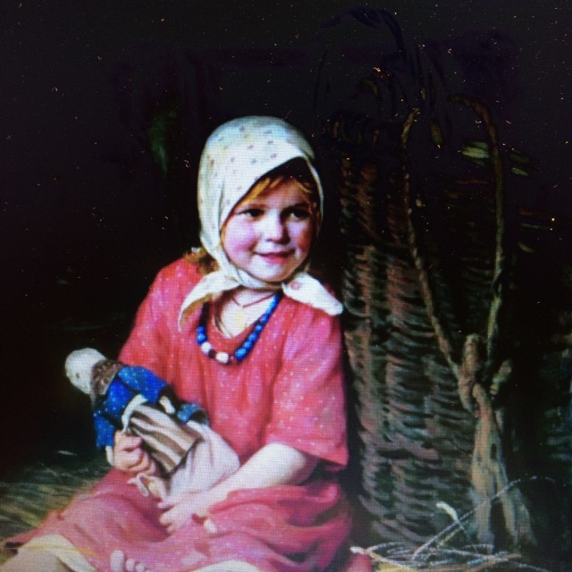 На картинке изображена маленькая девочка. В руках девочка держит куклу, одета она в розовое платице , и белый платочек . ноги у нее босые , еще на девочке голубо белые . Лицо девочки очень радостное . щечки у нее красные, волосы ее рыжие, на заднем фоне стоит корзина , сидит на саломе ( точно не знаю)