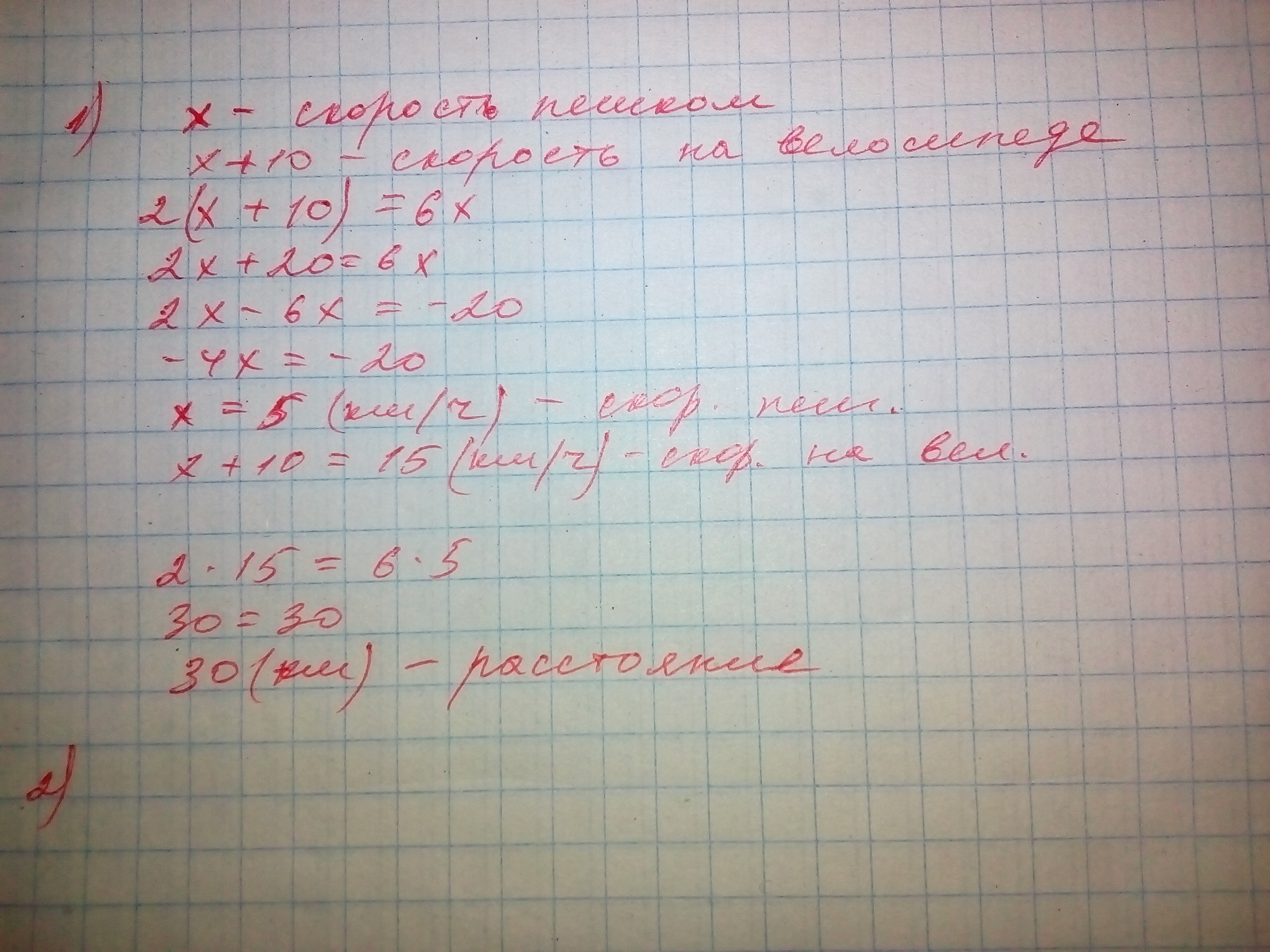 От станции до озера турист доехал на велосипеде за 2 ч. Пешком он мог бы пройти это расстояние за 6 ч. Чему равно расстояние от станции до озера, если на велосипеде турист едет со скоростью, на 10 км/ч большей, чем идёт пешком?РЕШИТЕ ЗАДАЧУ, СОСТАВИВ УРАВНЕНИЯ ДВУМЯ СПОСОБАМИ: 1) ОБОЗНАЧИВ БУКВОЙ КАКУЮ-НИБУДЬ СКОРОСТЬ ДВИЖЕНИЯ2) ОБОЗНАЧИВ БУКВОЙ ИСКОМОЕ РАССТОЯНИЕ