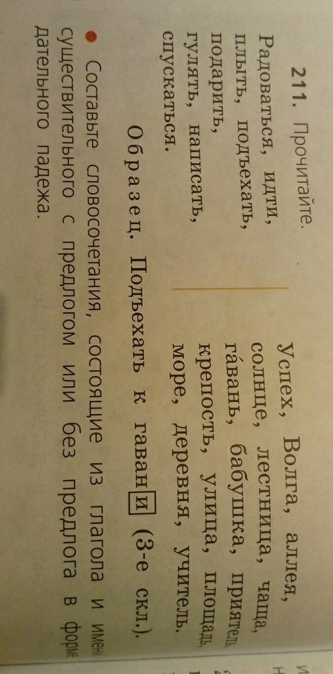 Радоваться успеху, плыть по Волге, гулять по улице, спускаться по лестнице, подъехать к морю, идти по площади, ехать к приятелю, подарить бабушке, гулять по аллее, плыть по морю, радоваться солнцу, написать приятелю, написать бабушке, идти к чаще, подъехать к деревне.