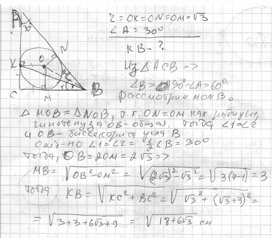 Окружность радиуса корня из 3, вписанная в прямоугольный треугольник АВС с углом А равному тридцати градусам, касается катета АС с точке К. Найти ВК.