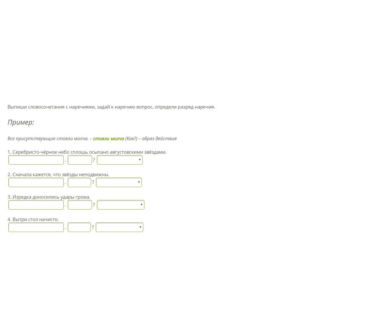 1.Осыпано сплошь.(Как?) -образ действия...2.Кажется сначала.(Когда?) -времени...3.Доносились изредка.(Как долго?) -времени...4.Вытри начисто.(Как?) -образ действия.