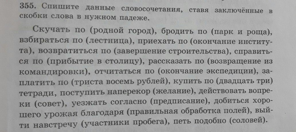 Скучать по родному городу,бродить по парку и роще,взбираться по лестнице,приехать по окончанию института,возвратиться по завершению строительства,справиться по прибытию в столицу,рассказать по возвращению из командировки,отчитаться по окончанию экспедиции,заплатить по триста восемь рублей,купить по двадцать три тетрадей,поступить наперекор желанию,действовать вопреки совету,уезжать согласно предписанию,добиться хорошего урожая благодаря правильной обработке полей,выйти навстречу участникам пробега,петь подобно соловью.
