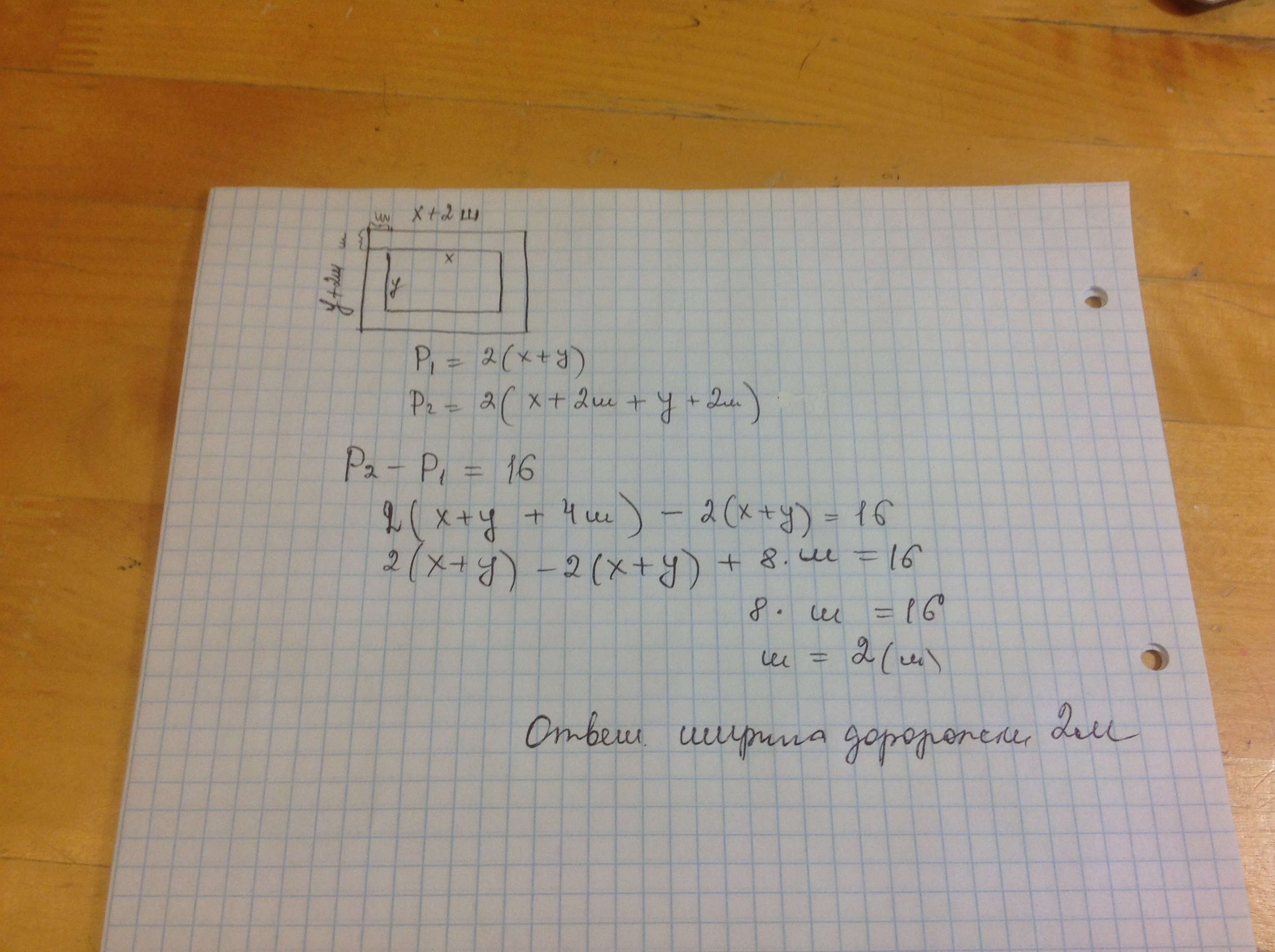 вокруг прямоугольного озера устроена набережная которая на всем своем протяжении имеет одиковую ширинуу наружная граница набережной на 16м длинее ванутреней какова ширина набережной