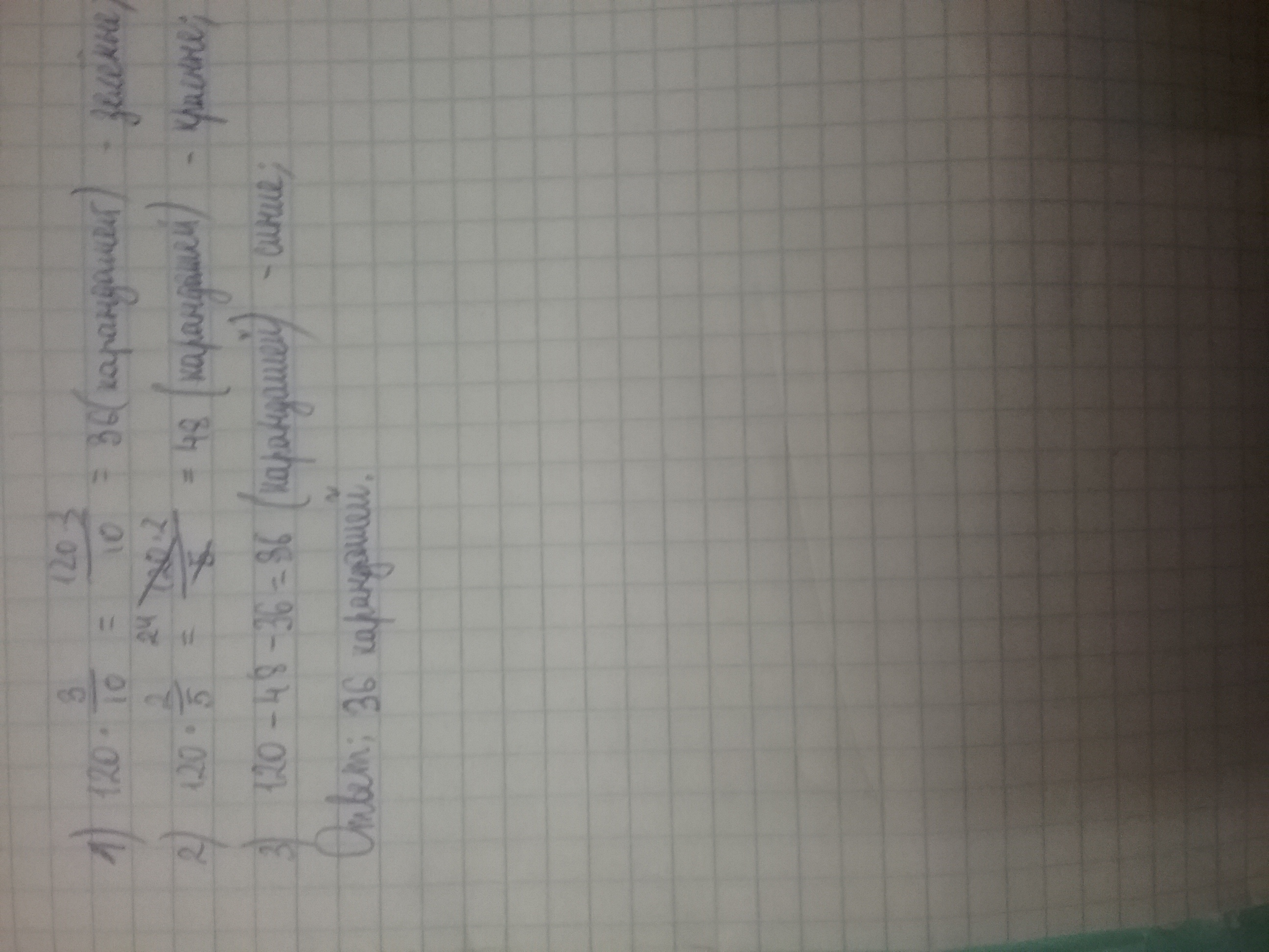 В коробке лежало 120 карандашей, из них 3/10 зелёного цвета, 2/5 красного цвета, а остальные карандаши синие. Сколько синих карандашей в коробке?