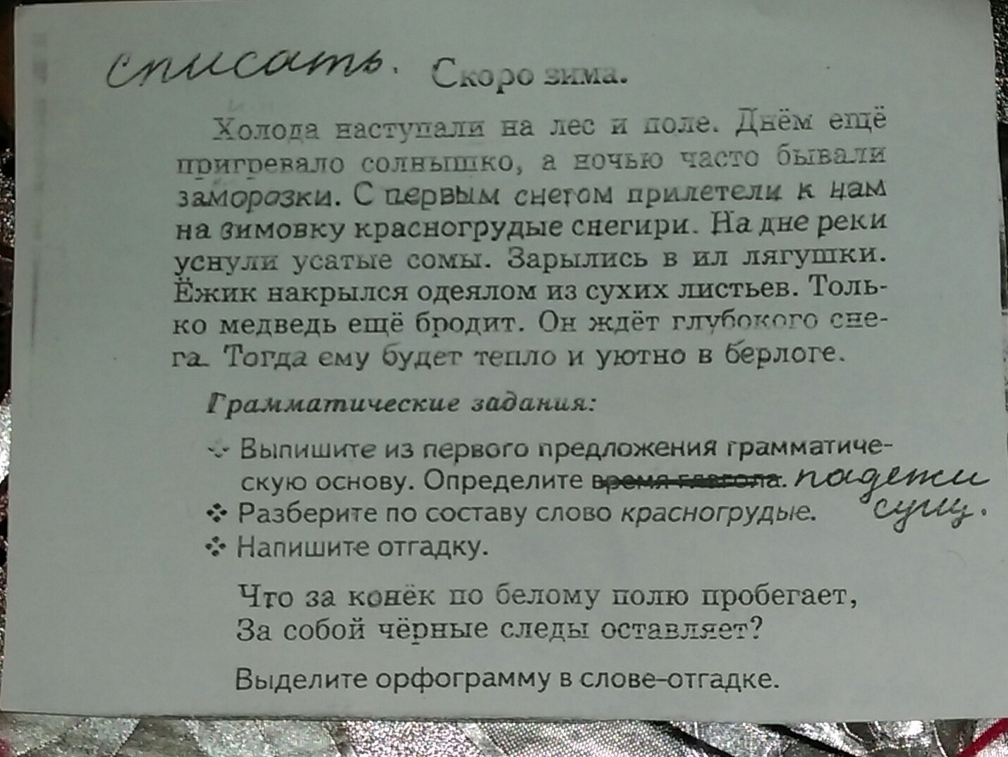 Помогите пожалуйста определить падеж существительное и определить первого предложения грамматическую основу и разбирать по составу слово красногрудые.