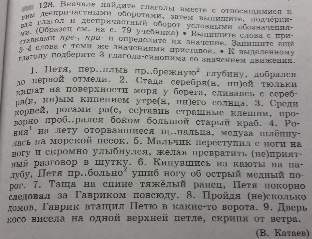 глаголы с деепричастными оборотами: добрался(как?), переплыв прибрежную глубину 2. кишат, сливаясь с серебряным кипением утреннего Солнца. 3. Пробирался, рогами расставив страшные клешни