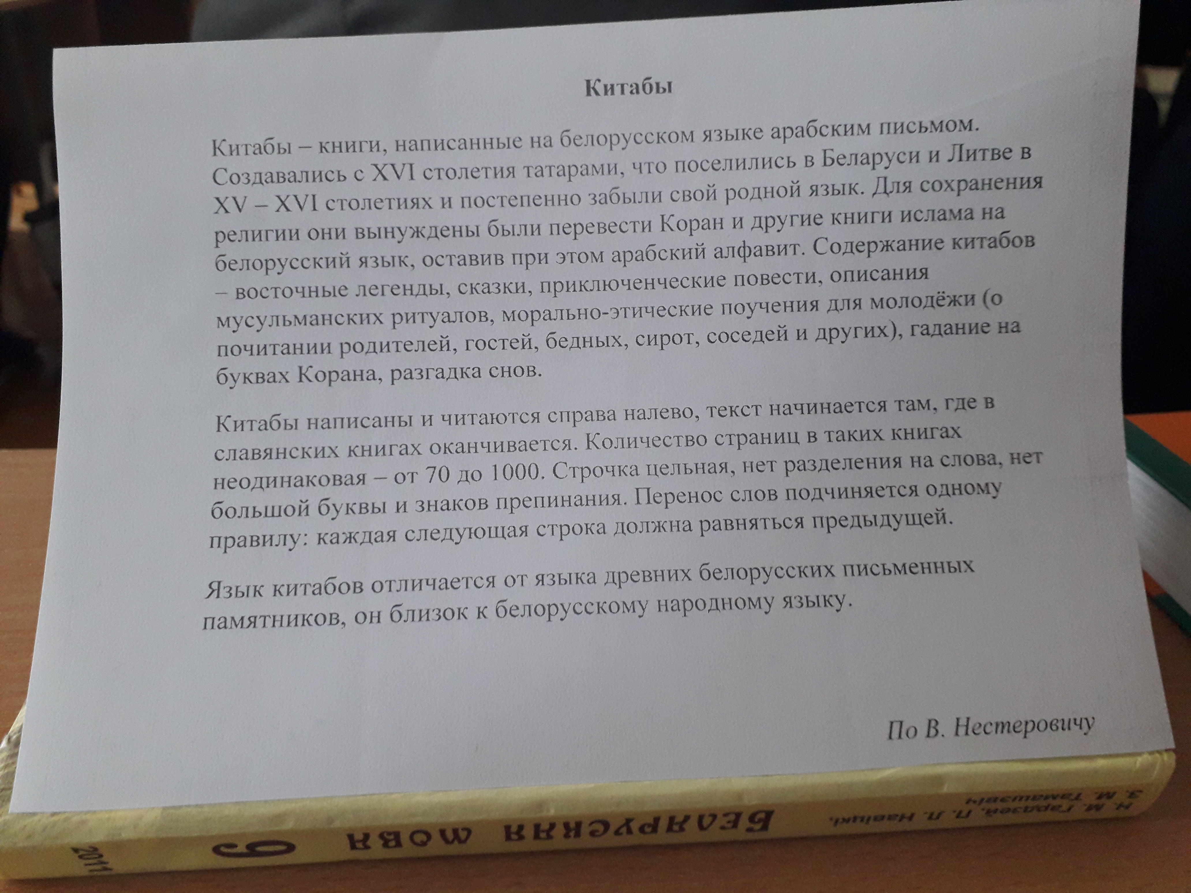 Кiтабы-книги написаныя на беларускай мове арабским письмом.Стваралися с ХV|стагоддзя татарами у Беларуси и Литве у ХV-XVстагоддзи и паступрва запамятавали сваю робную мову.Для зберажэння религии яны вымушаныя былиперакласци Каран и иншыя книги таксама на беларускую мову,покiнуушы пры гэтым агабски алфавит Змест Китабау-усходния легенды,казки,прыгадницкия повесци,аписане мусульманских рытуалау,маральна -этычных павучанняу для моладзи.(аб пачытанни бацькоу,гасцей,бедных,сирот,суседзяу и иншых)варажба на литарах Карана,разгадка сноу.