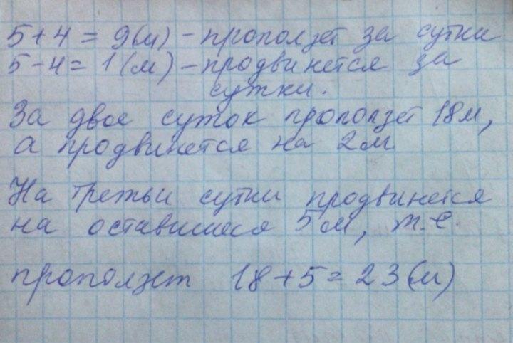 гусеница ползет вверх и вниз по дереву высотой 7 м. За день она поднимается на 5 м,а за ночь опускается на 4м. Сколько всего метров проползет гусеница ,прежде чем доберется до вершины дерева?