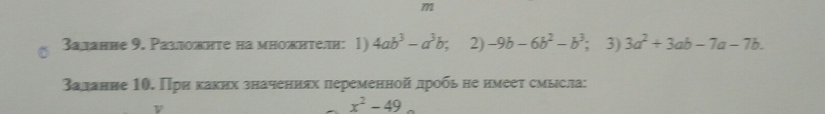 1)4ab {}^{3}  - a {}^{3} b = ab(4b {}^{2}  - a {}^{2} ) = ab((2b) {}^{2}  - a {}^{2} ) =  \  = ab(2b - a)(2b + a) \ 2) - 9b - 6b {}^{2}  - b {}^{3}  =  - b(9 + 6b + b {}^{2} ) =  - b(3 + b) {}^{2}  \ 3)3a {}^{2}  + 3ab - 7a - 7b = 3a(a + b) - 7(a + b) =  \  = (a + b)(3a - 7)