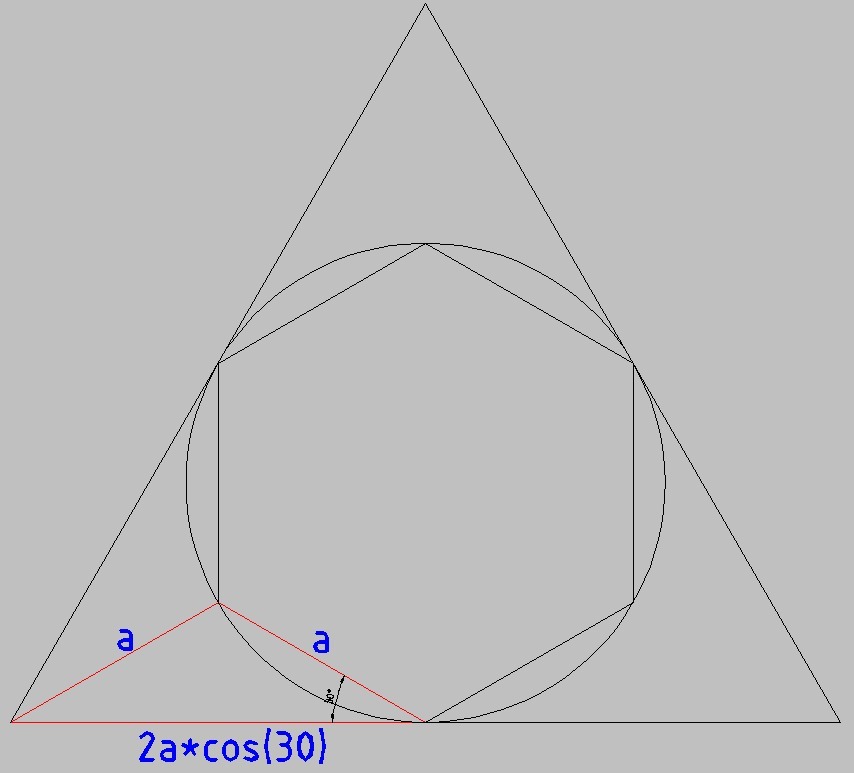 рассмотрим красный треугольник. Его боковая сторона равна стороне вписанного шестиугольника a, а основание - половина стороны описанного треугольника b