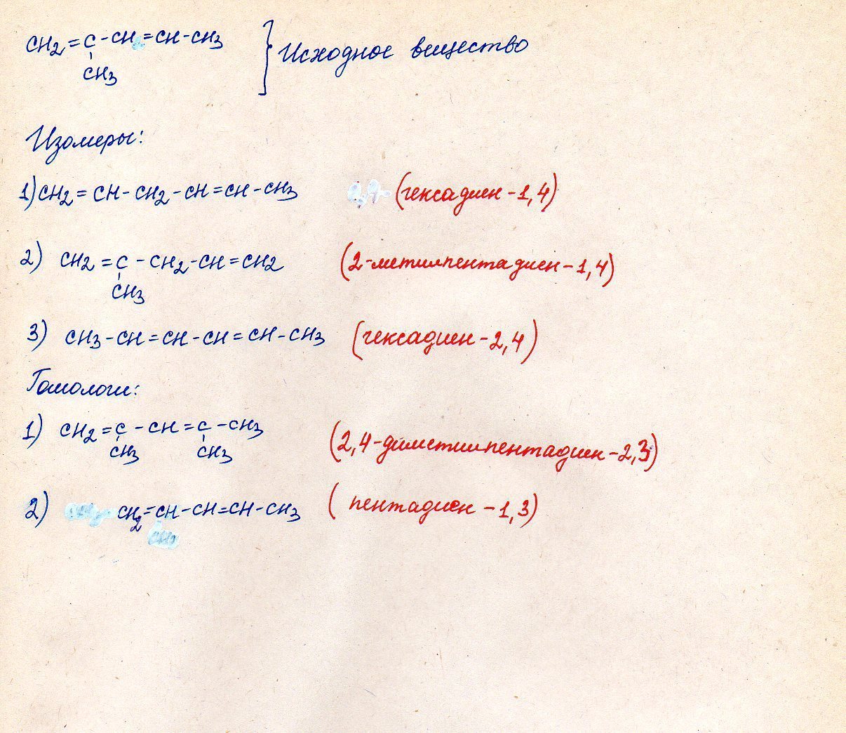 для вещества 2-метилпентадиен-1,3 составить формулы двух гомологов и трех изомеров (положения кратных связей, углеродного скелета, другого класса углеводорода). назвать эти вещества. СРОЧНО! ПОЖАЛУЙСТА!
