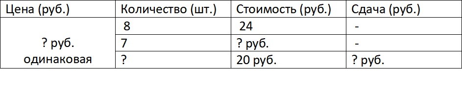 1) 24 : 8 = 3 (руб.) цена карандаша