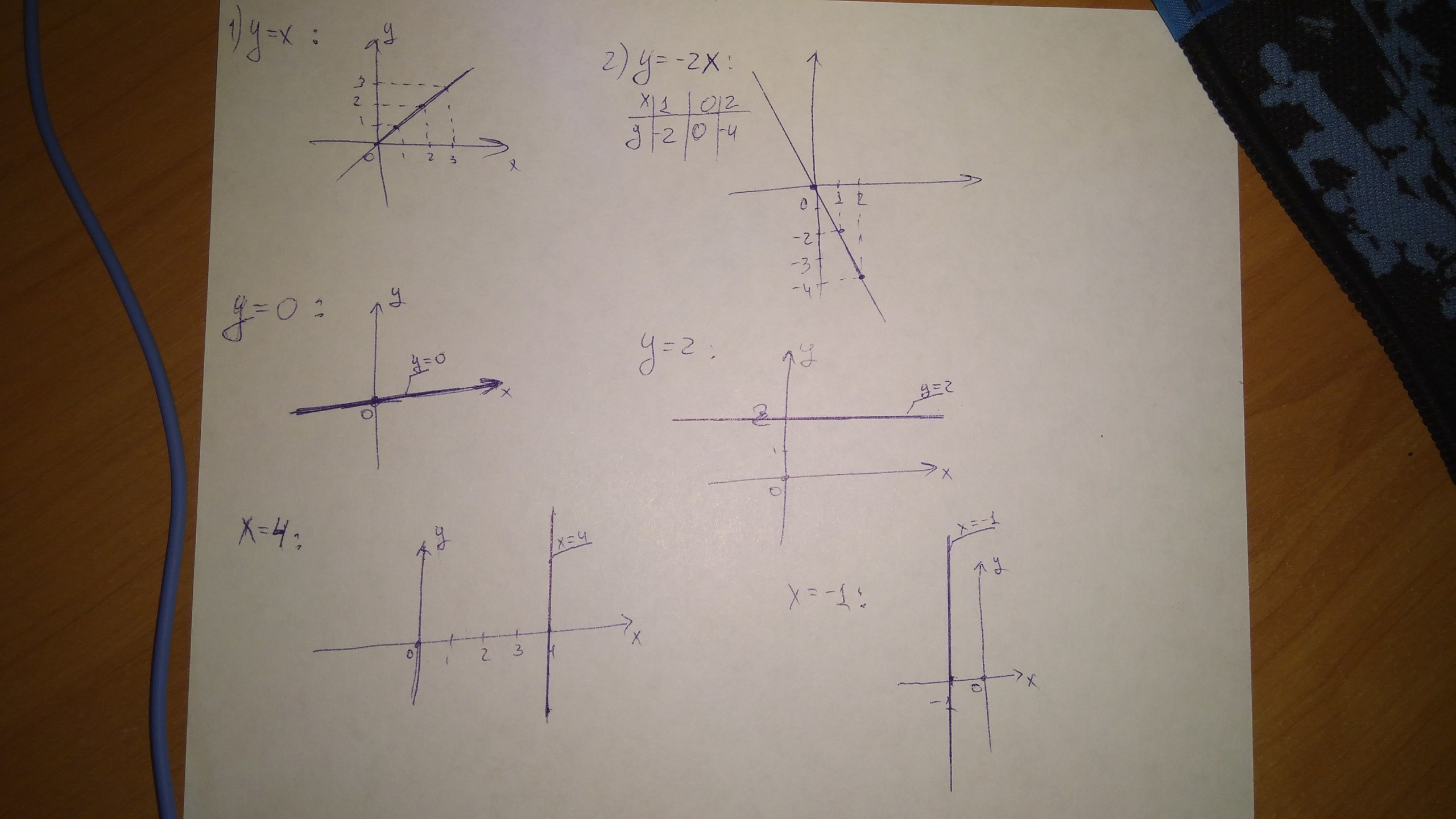 Постройте график функции у=х, у=-2х, у=2х+3. Что является графиком уравнение у=0, у=2, х=0, х=4, х=-1?