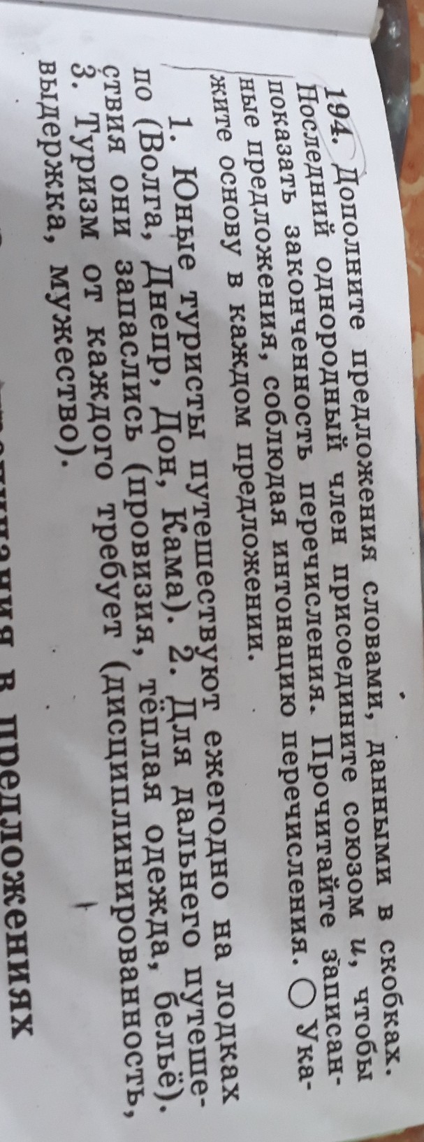 Юные туристы путешествуют ежегодно на лодках по Волге, Днепру, Дону и Каме. (грамматическая основа туристы - подлежащее, путешествуют - сказуемое) Для дальнего путешествия они запаслись провизией, тёплой одеждой и бельём. (грамматическая основа они - подлежащее, запаслись - сказуемое)Туризм от каждого требует дисциплинированности, выдержки и мужества. (грамматическая основа туризм - подлежащее, требует - сказуемое)
