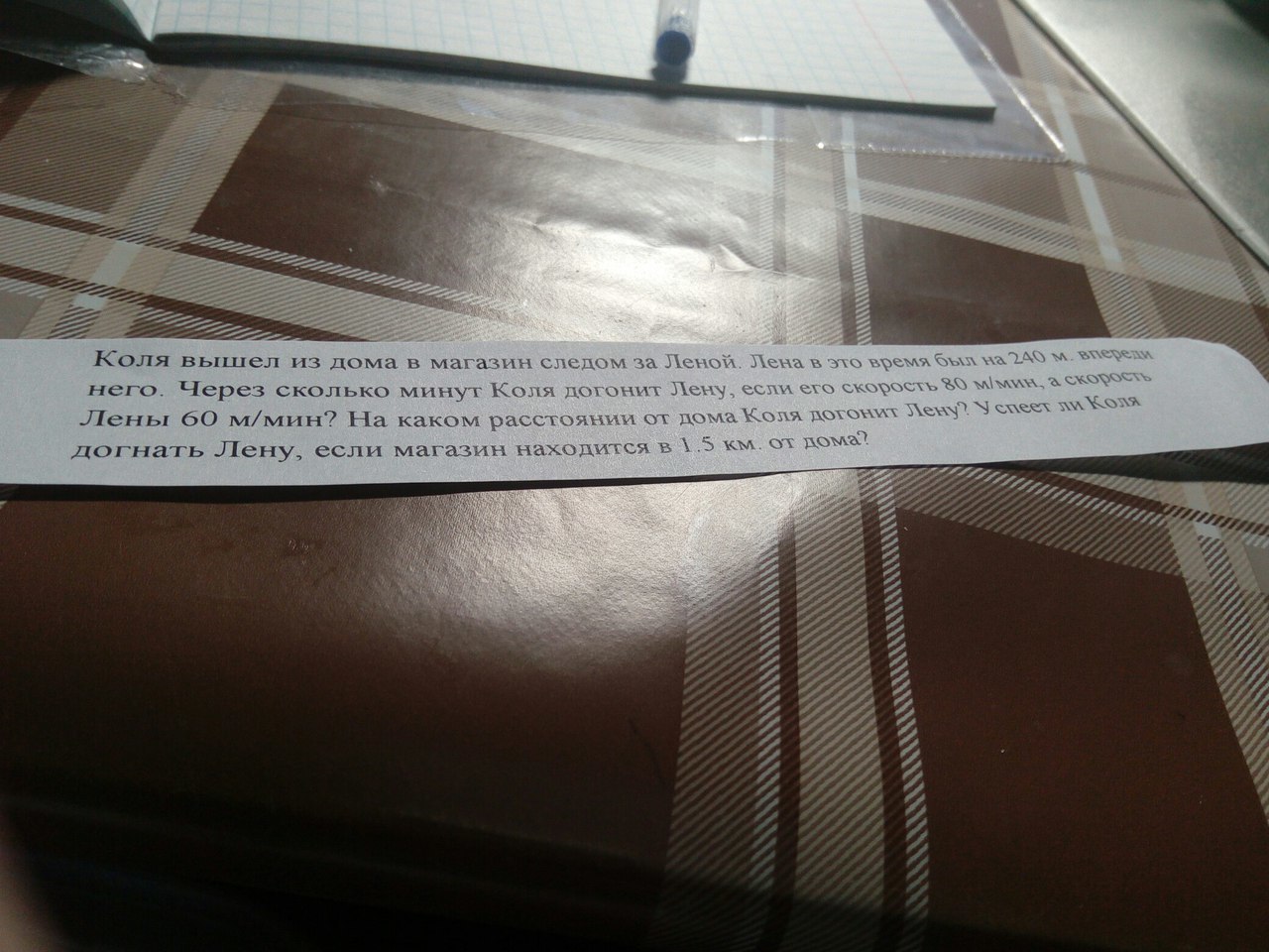 Сперва переведем еденицы в метры 1.5км=1500 метров, далее находим скорость сближения 80-60 =20км/час, далее найдем за сколько Коля дагонит Лену 240:20= 12 минут, Коля успеет догнать лену т.к. за 12 мин она пройдет 12*60=720 метров