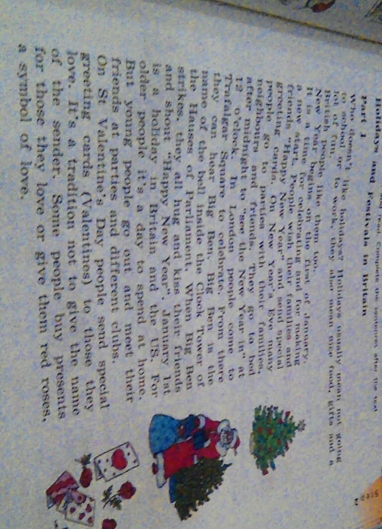 Новый год начинается первого января. Это время для празднования и новых начинаний. Люди желают их семьям и друзьям Счастливого Нового года и шлют им специальные подарочные открытки. Они идут спать после полуночи, чтобы встретить Новый год в 12:00. В Лондоне люди идут на Трафальгар сквер чтобы праздновать. Оттуда слышно Биг Бен. Биг Бен это название колокола внутри башни Парламентского дома. Когда биг бен звонит, все целуют своих друзей, и желают Счастливого новога года. 1 января это выходной в Великобритании и США. Для взрослых это день, какой проводят дома. Но молодые люди идут гулять с друзьями на вечеринки.