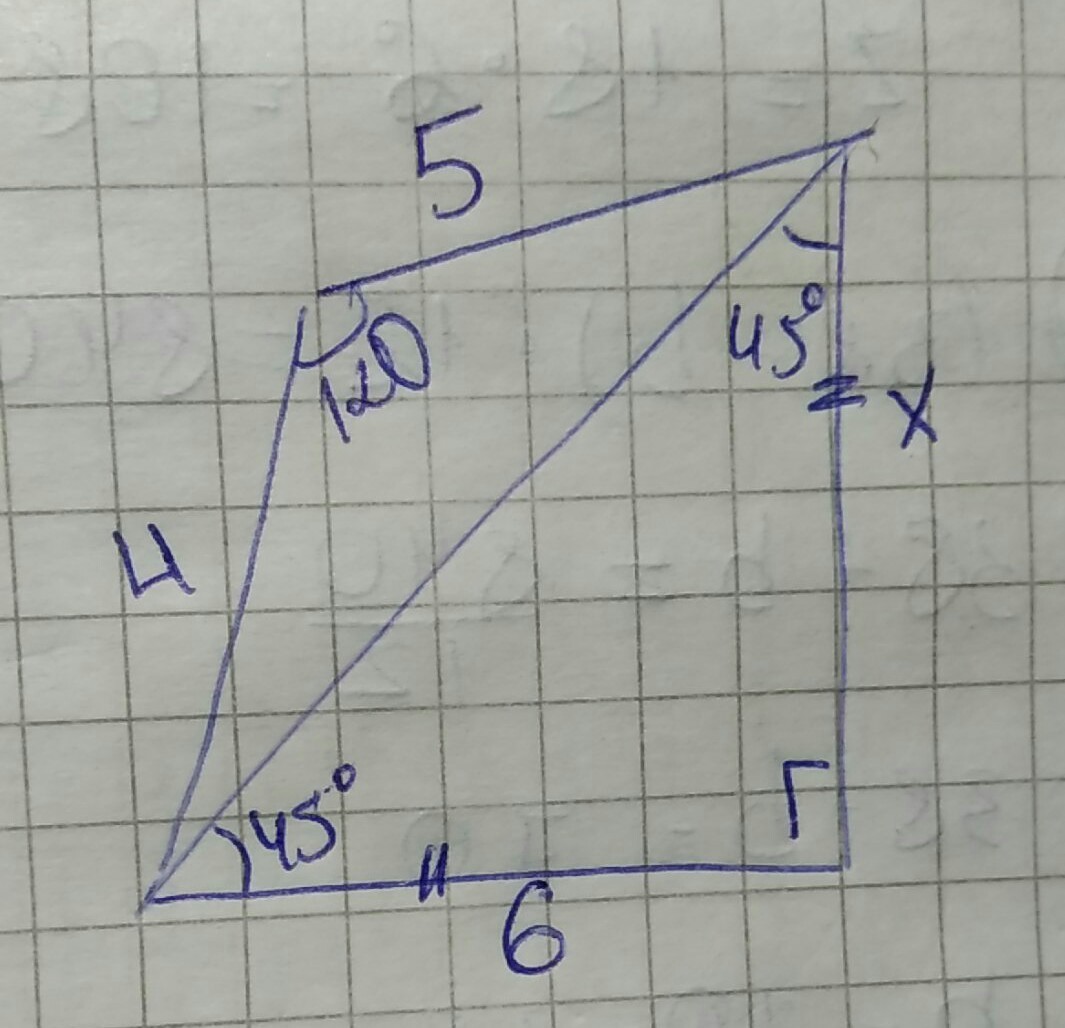 Там где углы не обозначены проведи прямую, так нижний треугольник будет прямоугольным, значит он будет равнобедренным из этого следует что сторона х будет равна 6