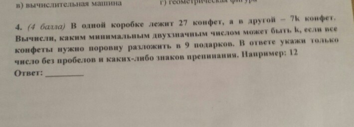 27 + 7k – общее количество конфет. Это количество должно делится без остатка на 9, чтобы его можно было разделить поровну на 9 подарков. Значит, 7k должно делится на 9, что возможно только в том случае, когда k делится на 9. Таким образом, минимальным двузначным числом, которое делится на 9, является число 18.
