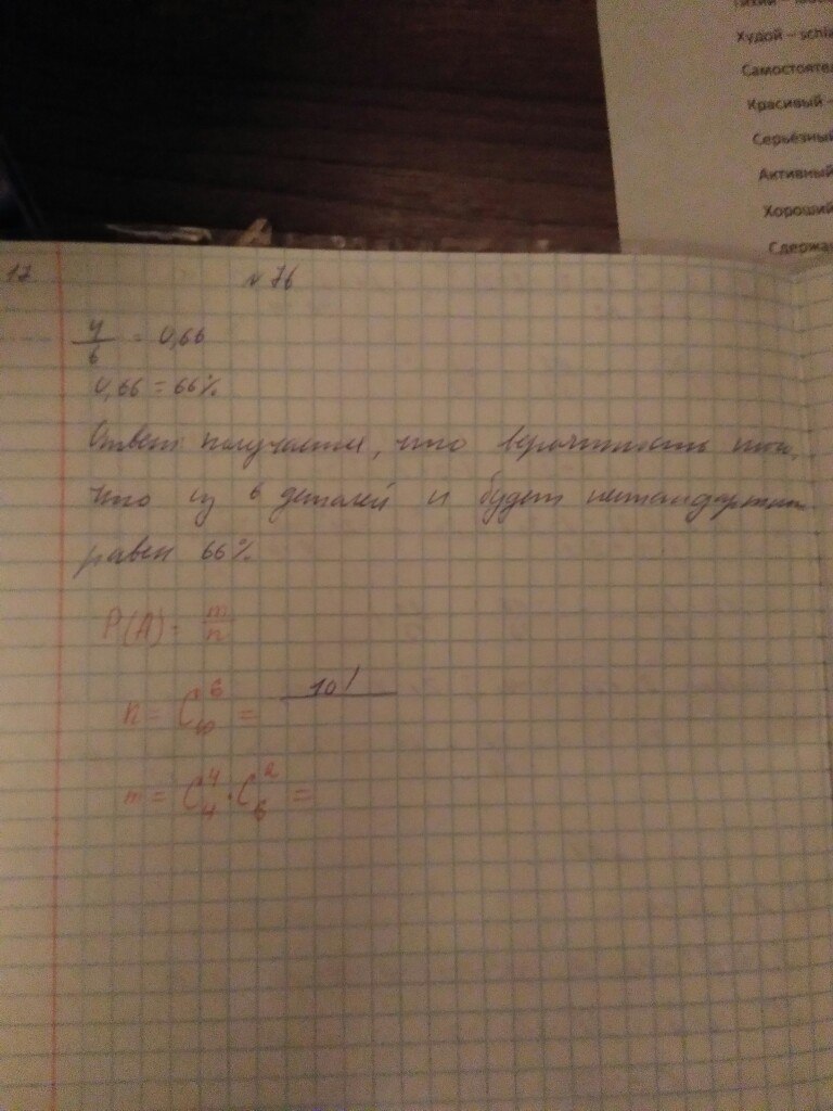 Из 10 деталей 6 стандартных. Какова вероятность того, что из 6 отобранных деталей 4 нестандартных?