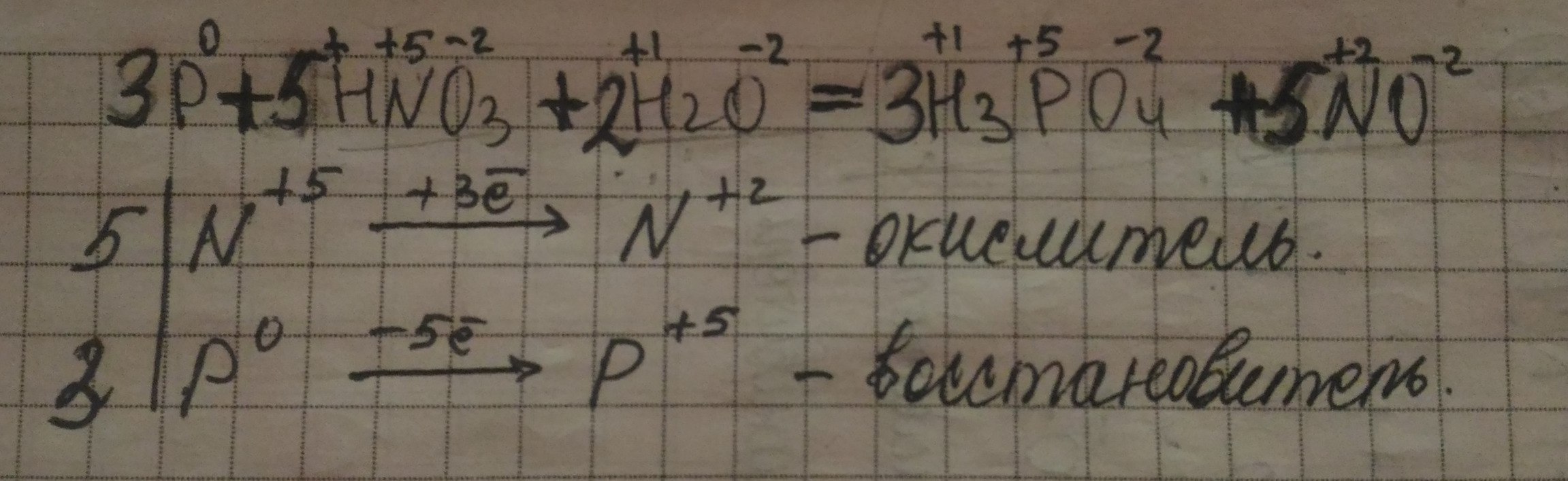 2) P+HNO3+H2O=H3PO4+NO.