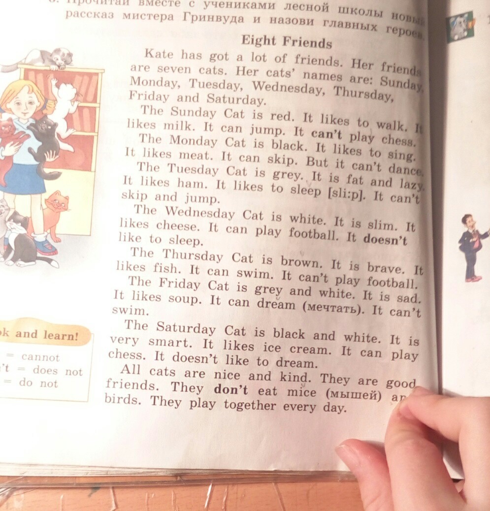 Кот по имени Понедельник черный. Он любит петь. Он любит мясо.Он может прыгать. Но он не умеет танцевать.