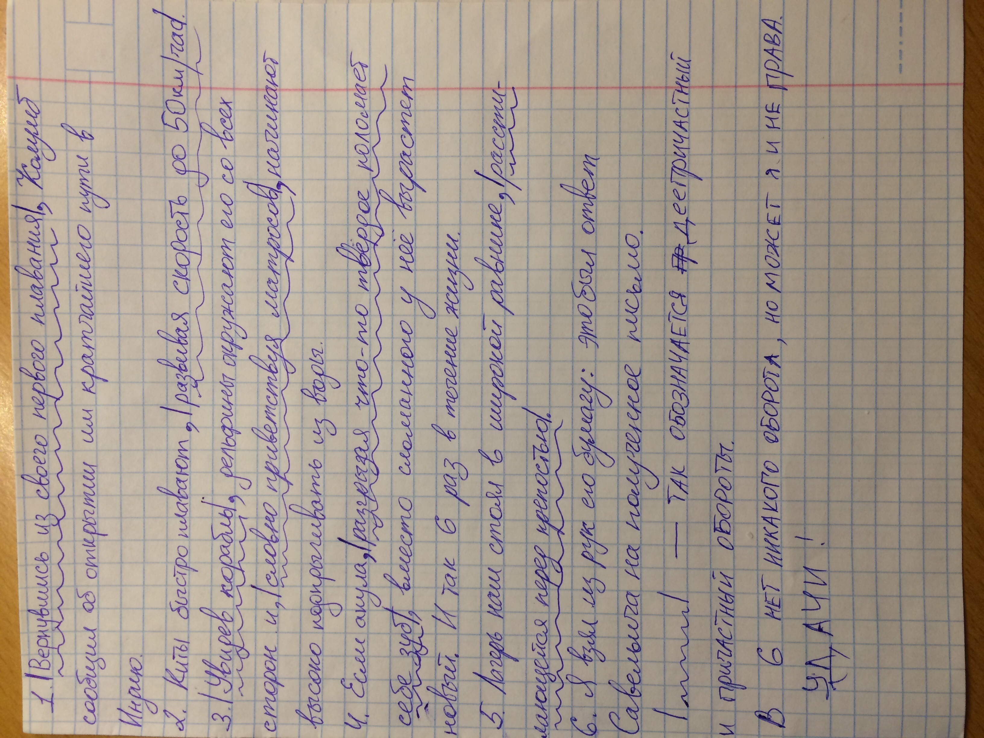 Только чтобы я понял как делать ото некоторые че то снизу подчеркивают я не понимаю что говорите где одной чертой или где начинается причастный оборот крестиком где заканчивается, где волнистая, благодарка, и топ ответ кину)