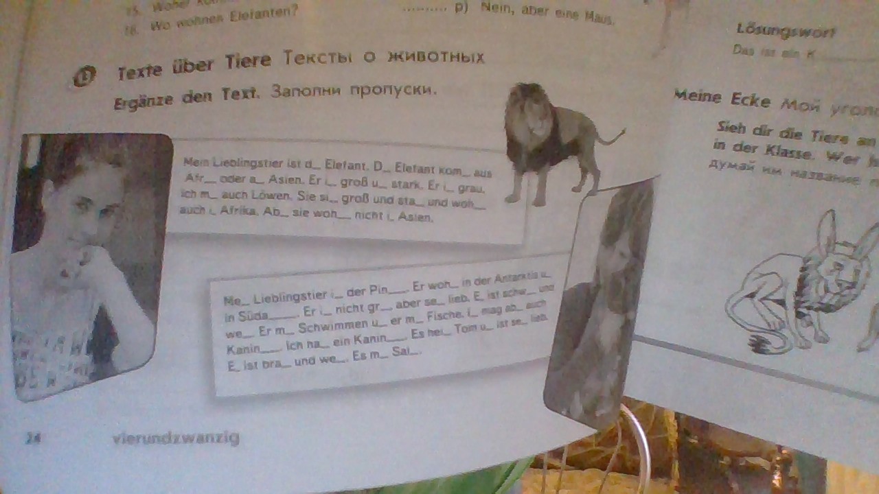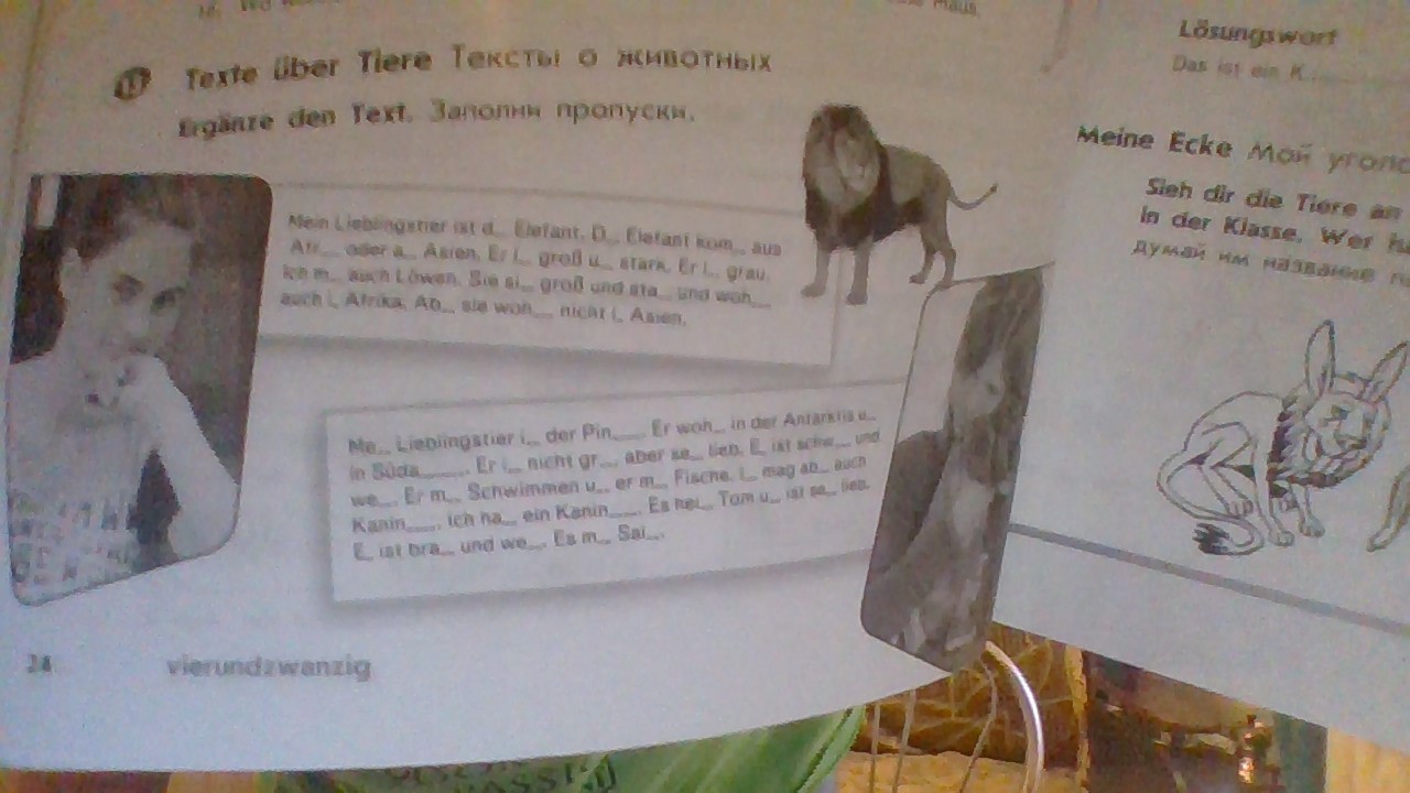 Mein Lieblingstier ist der Pinguin. Er wohnt in der Antarktis und in Südamerika. Er ist nicht groß, aber sehr lieb.Er ist schwarz und weiß. Er mag Schwimmen und er mag Fische. Ich mag aber auch Kaninchen. Ich habe ein Kaninchen. Es heißt Tom und ist sehr (не разберу это слово, но там вставлять ничего не нужно). Es ist braun und weiß. Es mag Salat.