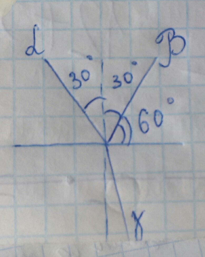 А) Угол между падающим и отраженным = 30+30 = 60° (т.к. угол падения = углу отражения)