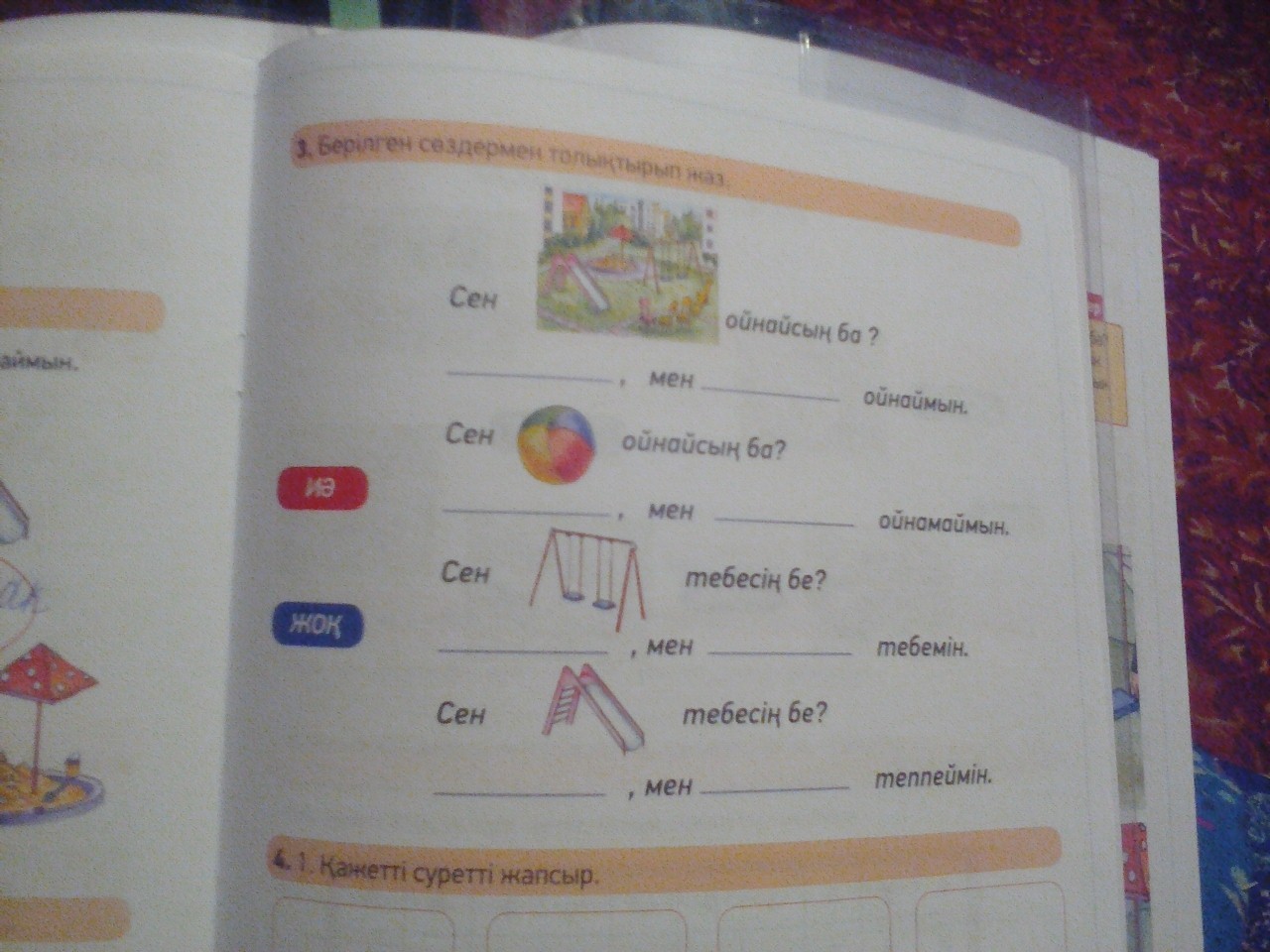 Получается в 1ом вопрос : Сен площадкада ойнайсынба?и ответ Иа, мен площадкада ойнаймын.