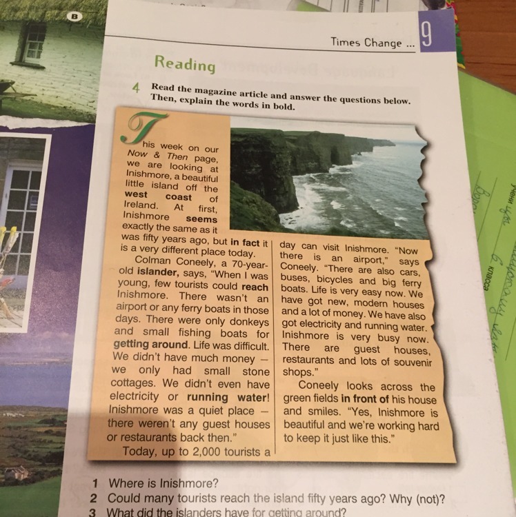 ЧтениеПрочитайте статью журнала и ответьте на вопросы ниже.Тогда объясните слова жирным шрифтом.его неделю на нашемСейчас и тогда страницы,мы смотрим наИнишмор красивыймаленький островвестпобережьеИрландия.Инишморказатьсяточно так же, как онбыло пятьдесят лет назад, но на самом деле это день можно посетить Инишморсегодня совсем другое место.тамаэропорт, говорит rКолман Коннелли, 70-летний Кони. -Есть также автомобили,Старый Islander, говорит, Когда были автобусы, велосипеды и большой паромМолодые, немногие туристы могли добраться до лодок. Жизнь сейчас очень проста. МыИнишмор. Там не появились новые, современные домааэропорт или любой паром лодки в тех и много денег. Мы такжедни. Остались только ослы, получившие электричество и проточную воду.и небольшие рыбацкие лодки для Инишмор очень занят сейчас.Поезжай. Жизнь была трудной. Есть гостевые дома,У нас не было много денег - рестораны и множество сувенирныхУ нас были только небольшие каменные магазины.коттеджи: у нас даже не былоКони смотрит наэлектричество или проточная вода! зеленые поля перед его домомИнишмор был тихим местоми улыбается Да, Инишмор естьне было никаких гостевых домов красивых, и мы работаем многоили ресторанов тогда.держать его так, как это,Сегодня до 20 туристов a!Где Инишмор?2 Могли ли многие туристы добраться до острова пятьдесят лет назад? почему (не?сделали островитяне есть длявокруг?