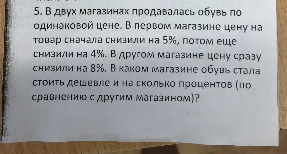 вроде так 1) 5%+4%=9% 2)9%-8%=1% Ответ в 1 магазине обувь стала дешевле на 1 процент
