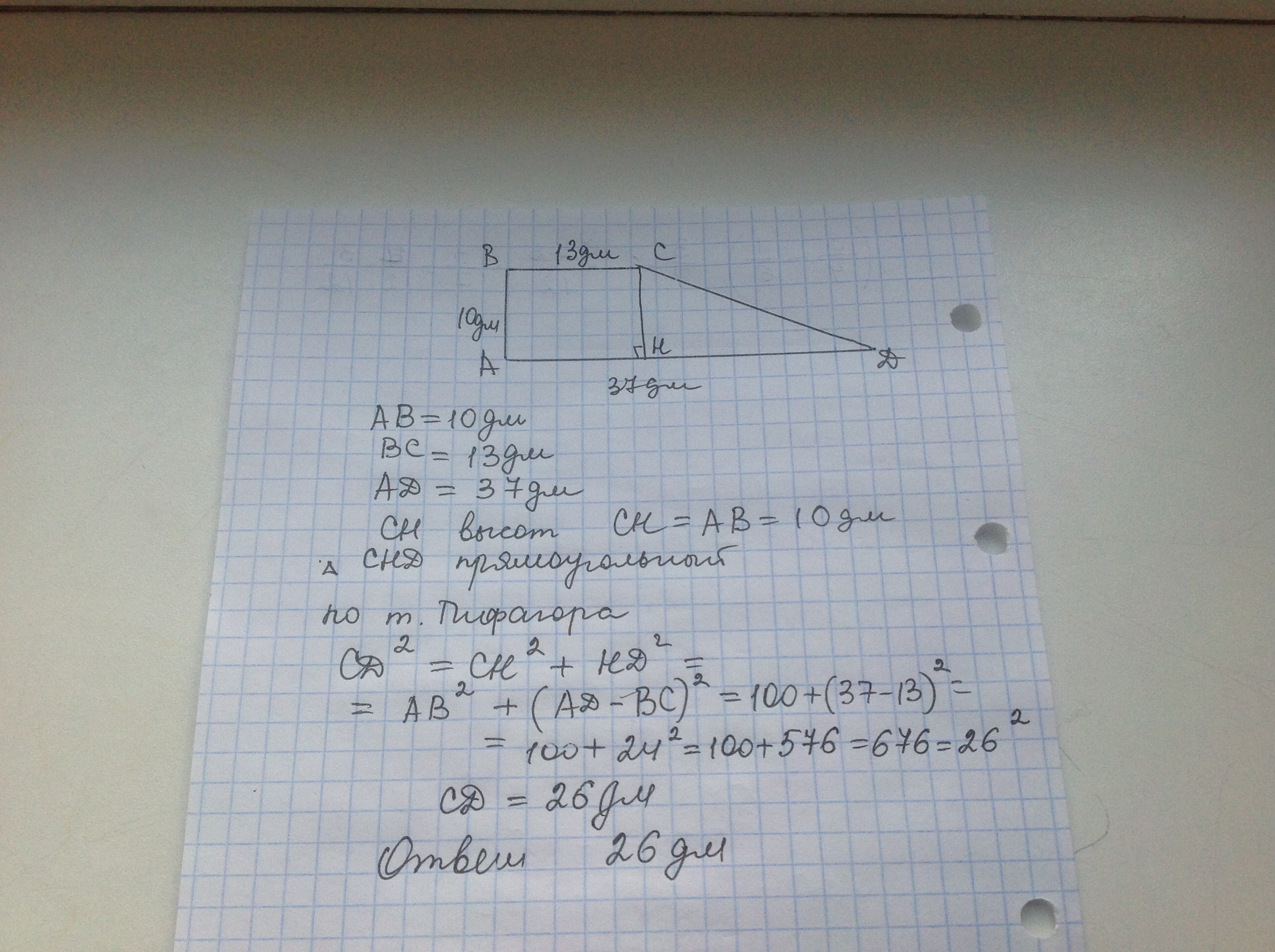 Основания прямоугольной трапеции равны 13 дм и 37 дм. Меньшая боковая сторона равна 10 дм.