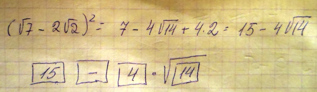 (√7-2√2)²=(√7)²-2*2√7*√2+(2√2)²=7-4√14+4*2=15-4√14