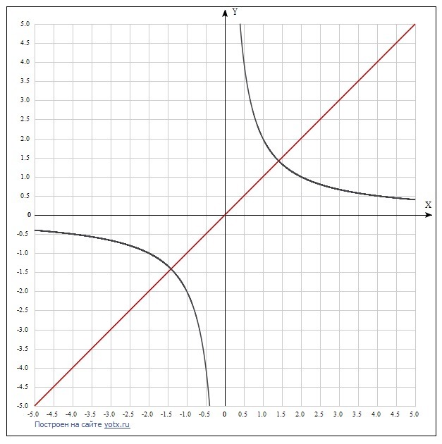 Строим графики двух функций: у=х и у = 2/х. Ищем абсциссу точки пересечения этих графиков. x≈1,4; х≈-1,4