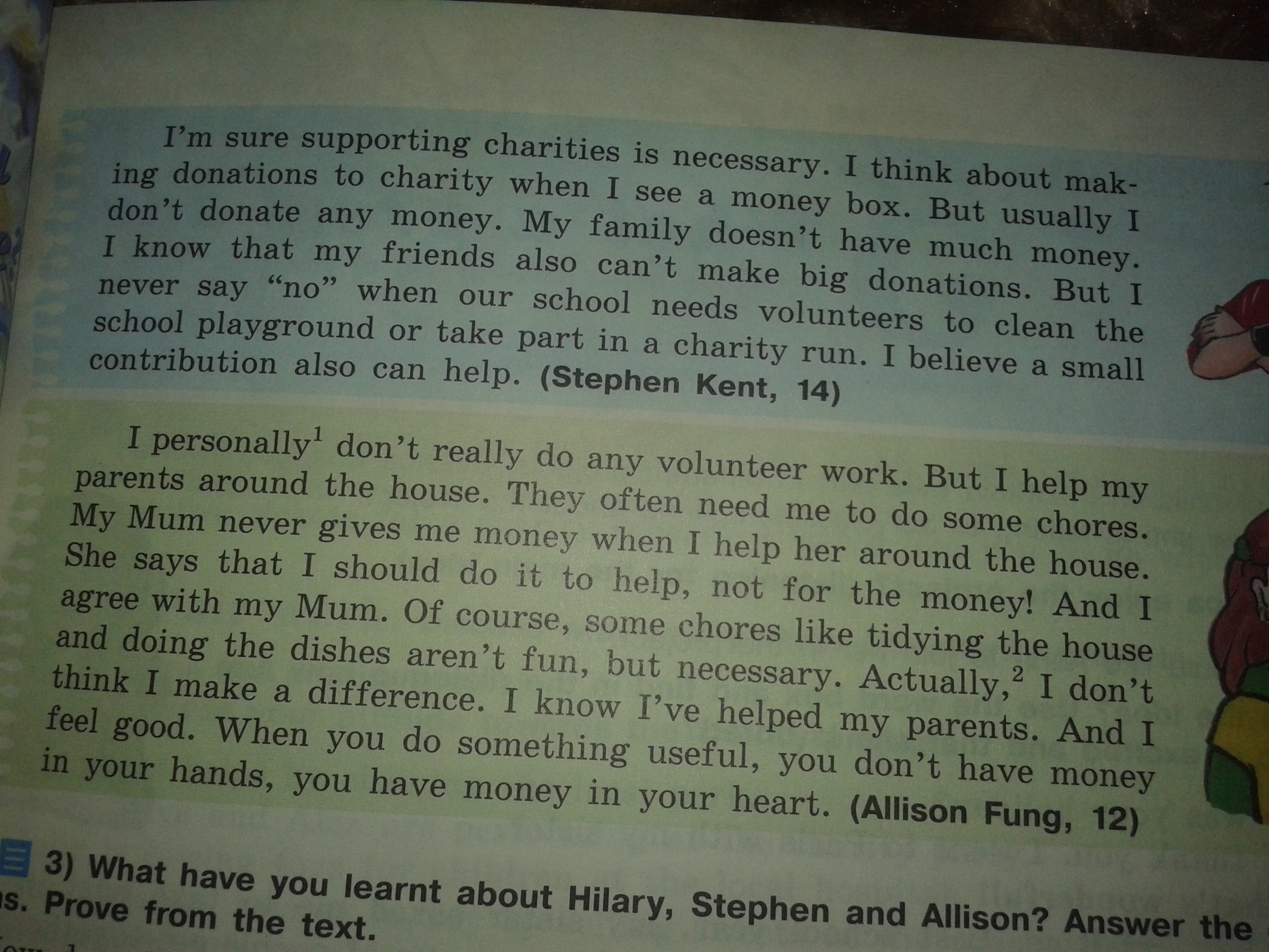 2. Лично я не занимаюсь какой-нибудь волонтерской работой. Но я помогаю родителям по дому. Они часто нуждаются во мне, чтобы помочь с некоторыми хлопотами. Моя мама никогда не дает мне денег, когда я помогаю ей по дому. Она говорит, что я должна это делать для помощи, не для денег! И я согласна с мамой. Конечно, некоторые хлопоты, такие как уборка дома и готовка(вот здесь не уверена, doing the dishes - делать блюда) не веселые, но необходимые. Собственно, я не замечаю разницы. Я знаю, что я помогла родителям. И я чувствую себя хорошо. Когда вы делаете что-то полезное, у вас нет денег в руках, деньги в вашем сердце.