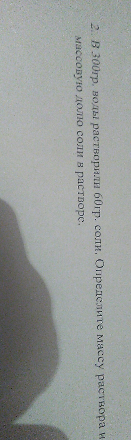 В 300 гр. воды растворили 60 гр. соли.Определите массу раствора и массовую долю соли в растворе