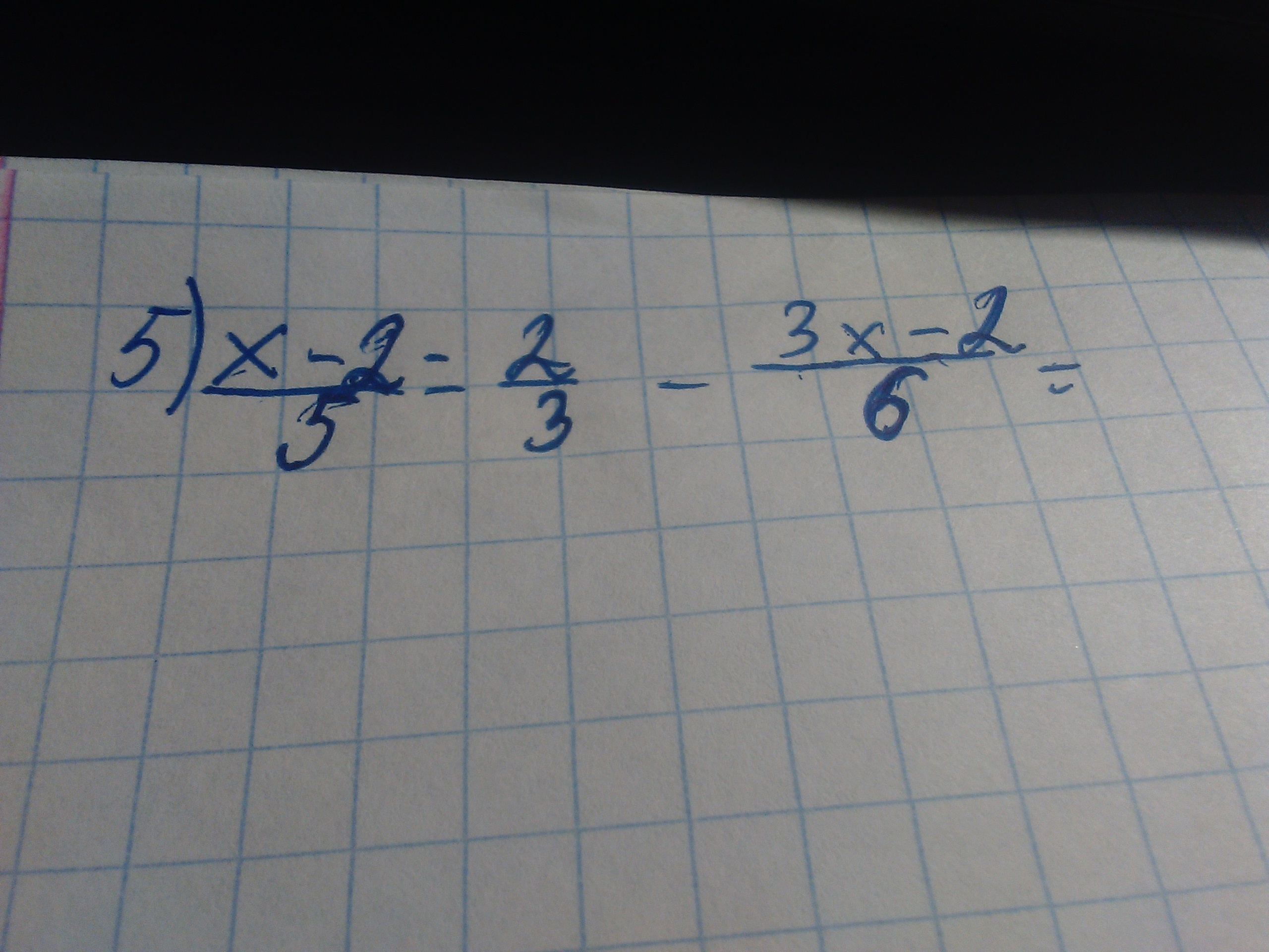 frac{x - 2}{5}  =  frac{2}{3}  -  frac{3x - 2}{6}  \  frac{x - 2}{5}  =  frac{4 - (3x - 2)}{6}  \  frac{x - 2}{5}  =  frac{6 - 3x}{6}  \ 6(x - 2) = 5(6 - 3x) \ 6x - 12 = 30 - 15x \ 21x = 42 \ x = 2