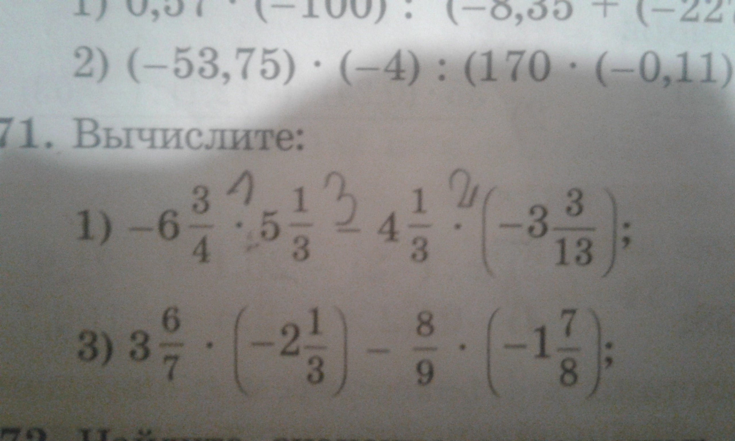1) -6 3/4×5 1/5-4 1/3×(-3 3/13)=- 27/4×16/3-13/3×42/13= 27 и 3 сокрашаем будет 9. 16и 4 будет 4 . 13 и 13 будет 1 и 42 и 3 будет 14.=-9×4-14=-36-14=-50